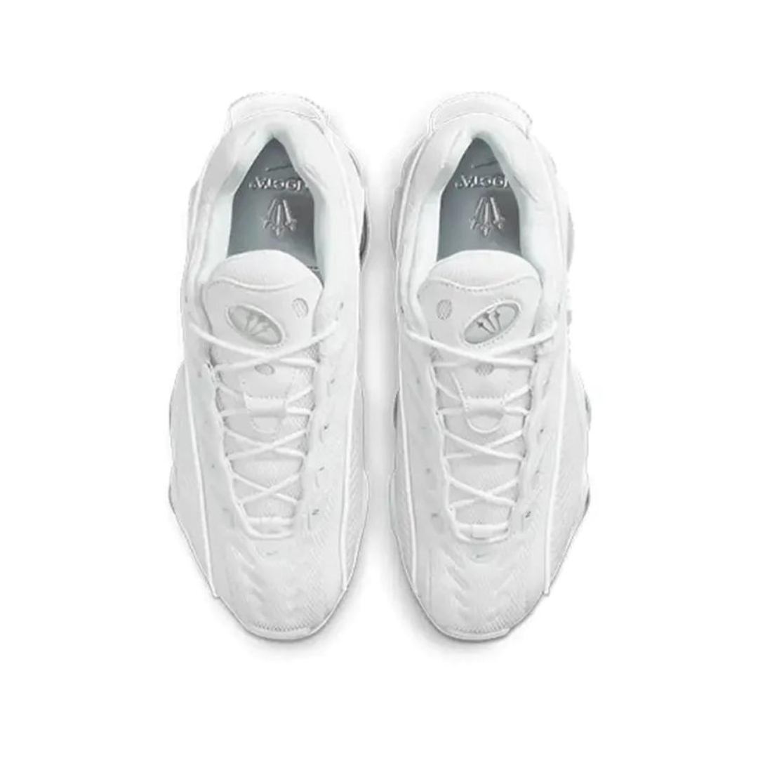 a collaboration between nike and drake, an all white sneaker with chrome detailing.